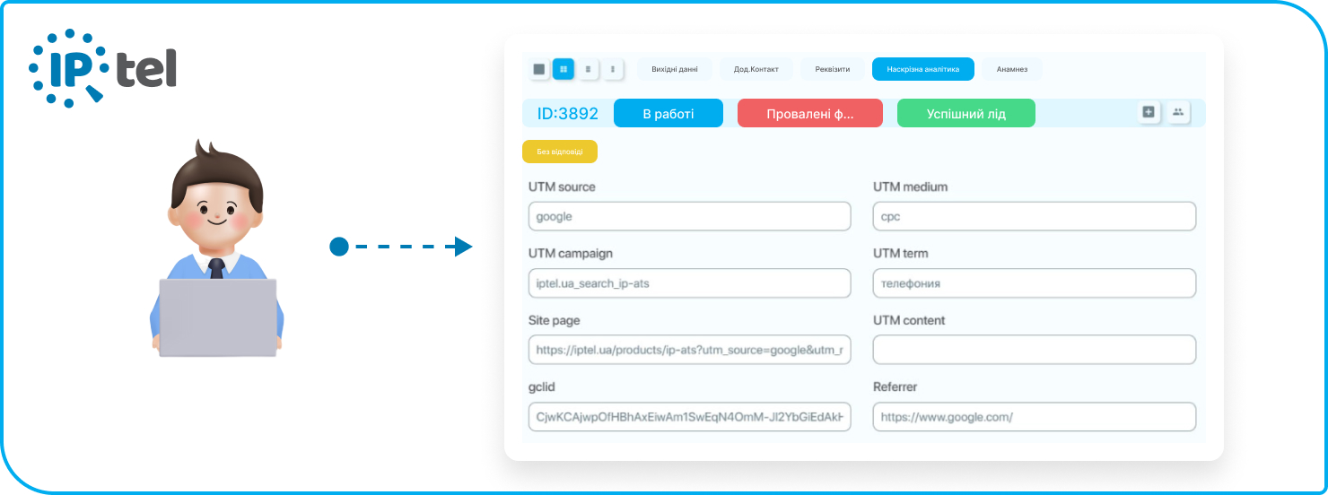 Розмова починається без затримок. Менеджер бачить у системі джерело запиту (з якого розділу сайту або рекламної кампанії надійшов дзвінок) і може вести діалог максимально предметно.