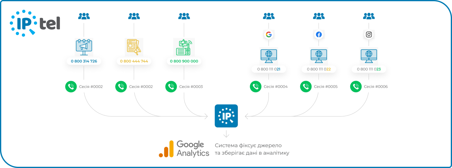 | Призначення номерів | Один номер на кожен офлайн-канал | Пул номерів під онлайн-трафік | Поєднання статичних і динамічних номерів |