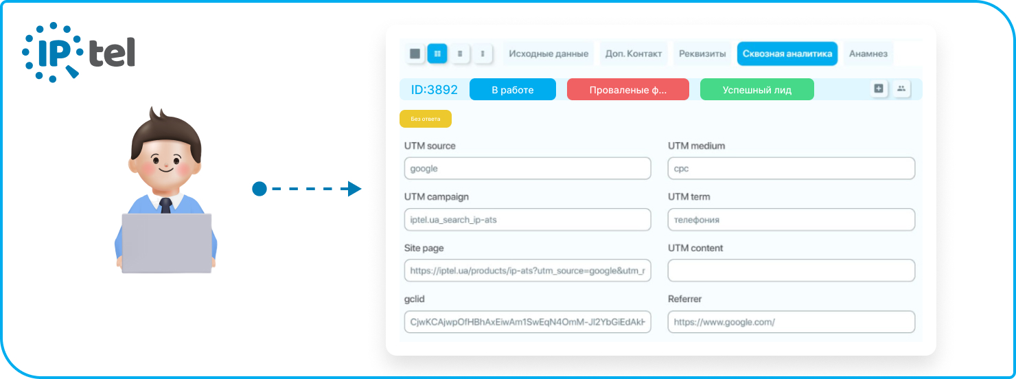 Кроме того, при необходимости возможность передавать данные об обращениях в Google Analytics.